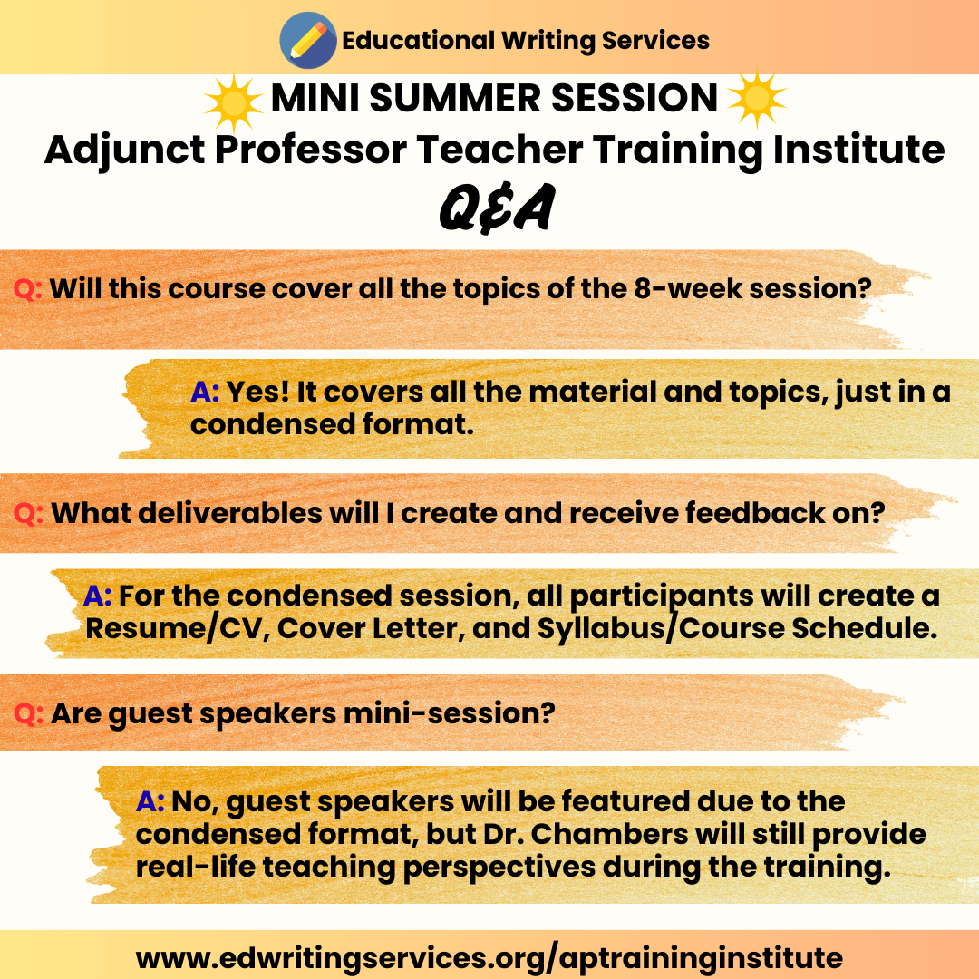 The recordings feature the 8 weeks of content for the Summer 2025 Adjunct Professor Teacher Training Institute. Over 7 hours of content and guest speaker sessions.